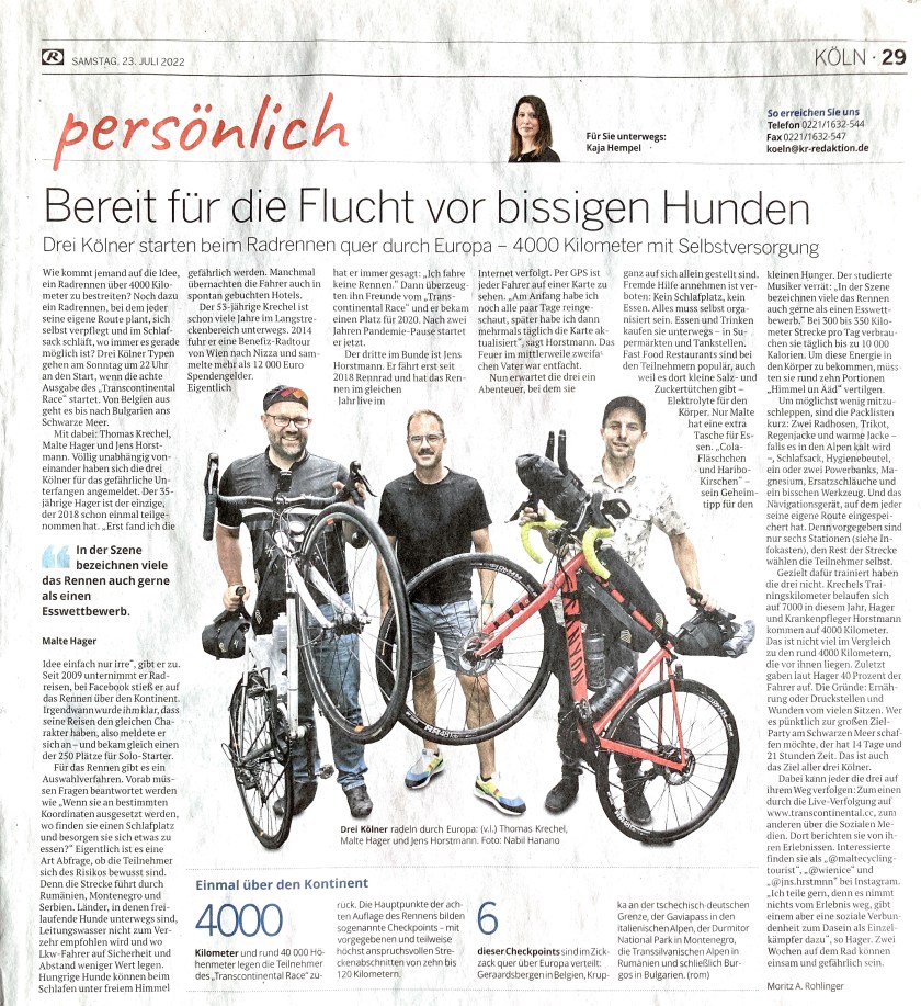 Transcontinental Race No. 8 – 2022 All posts and media appearances about my Transcontinental Race No. 8 in 2022. In chronological order. 01 TCRNo8 –About the Race & Live Tracking (Cap63) 02 TCRNo8 – My Rider Introduction 03 TCRNo8 – Equipment & Packing List TCRNo8 – about *preliminary* Results & Penalties TCRNo8 – about *official* results Results, stats, penalties update & subjective conclusion 23.07.2022 Kölnische Rundschau TCR No. 8 – Artikel VOR dem Rennen (German) 02.09.2022 – Gravel-Podcast & Video Interview TCR No. 8 vorher & nachher (German) 01.09.2022 – Kölnische Rundschau TCR No. 8 – Artikel NACH dem Rennen (German) 15.09.2022 – WDR Lokalzeit (live TV) TCR No. 8 – Live Interview & Clip (German) 05.10.2022 – Gravel-Podcast – TCR No. 8 – Ergebnisse & Penalties TCR No. 8 – Voräufige Ergebnisse & Penalties (German) 20.10.2022 – Kölner Stadt-Anzeiger TCR No. 8 – Video, Zeitungsartikel & Instagram-Reel (German) Rückblick & Videos: 2.2.23 – Vorträge beim “Travel Slam” – Köln (German) TCR No. 8 UPCOMING: Köln, So. 9.7.23 – Vortrag beim “Travel Slam” im Open-Air-Kino Köln (in German) TCR No. 8 share via... Click to share on Facebook (Opens in new window) Facebook Click to share on X (Opens in new window) X Click to email a link to a friend (Opens in new window) Email Click to share on Reddit (Opens in new window) Reddit Click to share on Pinterest (Opens in new window) Pinterest Like Loading...